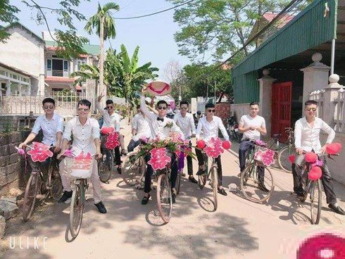 Hình ảnh chụp đoàn rước dâu khá đặc biệt đang thu hút trên mạng xã hội ngay khi vừa mới được chia sẻ. Chú rể mặc sơ mi trắng, quần âu đến đón dâu bằng xe đạp. Không chỉ chú rể mà dàn phù rể cũng đạp xe đi cùng. Ai cũng đeo đôi kính đen trông khá "ngầu".